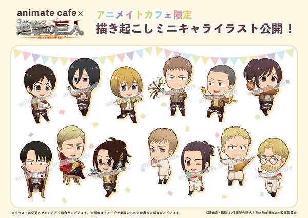 進撃の巨人 X アニメイトカフェ 頭身 ミニキャラ2種の描き下ろし公開 スイーツにはしゃぐ104期生らが可愛い 年10月7日 エキサイトニュース